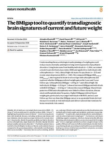 Understanding the neurobiological underpinnings of weight gain could reduce excess mortality and improve long-term trajectories of psychiatric disorders. Using brain scans from healthy individuals (n = 1,504), we trained a model to predict body mass index (BMI) and applied it to individuals with schizophrenia (n = 146), clinical high-risk states for psychosis (n = 213) and recent-onset depression (ROD, n = 200). We computed BMIgap (BMIpredicted − BMImeasured), interrogated its brain-level overlaps with schizophrenia and explored whether BMIgap predicted weight gain at the 1-year and 2-year follow-ups. Schizophrenia (BMIgap = 1.05 kg m−2) and clinical high-risk individuals (BMIgap = 0.51 kg m−2) showed increased BMIgap and individuals with ROD (BMIgap = −0.82 kg m−2) showed decreased BMIgap. Shared brain patterns of BMI and schizophrenia were linked to illness duration, disease onset and hospitalization frequency. Higher BMIgap predicted future weight gain, particularly in younger individuals with ROD, and at 2-year follow-up. Here we show that BMIgap can serve as a potential brain-derived measure to stratify at-risk individuals and deliver tailored interventions for better metabolic risk control.