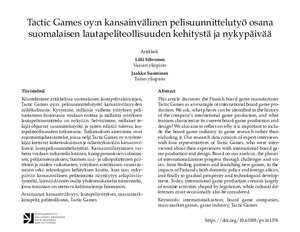 Käsittelemme artikkelissa suomalaisen lautapelivalmistajan, Tactic Games oy:n, pelisuunnittelutyötä kansainvälisyyden näkökulmasta. Kysymme, millaisia vaiheita yrityksen pelituotannon historiassa voidaan erottaa ja millaista yrityksen lautapelisuunnittelu on nykyään. Selvitämme, millaiset tekijät ohjaavat suunnittelutyötä ja miten edistää tulevaa lautapeliteollisuuden tutkimusta. Tutkimuksen aineistona ovat asiantuntijahaastattelut, joissa neljä Tactic Games oy:n työntekijää kertovat kokemuksistaan ja näkemyksistään kansainvälisestä lautapelisuunnittelutyöstä. Kansainvälistymisen vaiheita voidaan tarkastella kriisien, kumppanuuksien solmimisen, pelilanseerauksien, Suomen sisä- ja ulkopoliittisten päätösten ja niiden vaikutusten, yrityksen asteittaisen vaurastumisen sekä teknologian kehityksen kautta, kun taas nykypäivän kansainvälinen pelitoiminta näyttäytyy arkipäiväistyneeltä, lainsäädännön osalta yhdenmukaiselta toiminnalta, jossa toisinaan on otettava kulttuurieroja huomioon.