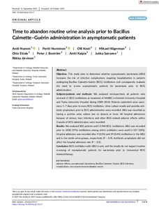 We analysed retrospectively all patients who received ≥1 BCG instillations as treatment of NMIBC in Helsinki University Hospital and Turku University Hospital during 2009–2018. Patients submitted urine specimens 1–7 days prior to every BCG instillation. Urine culture results and possible antibiotic prophylaxis prior to BCG administration were recorded. ABU was classified as having a positive urine culture but no dysuria or fever. All hospital admissions because of urinary tract infections and other BCG-related adverse effects within 2 weeks of BCG administration were recorded.