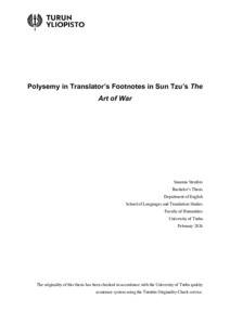 This thesis examines how a translator can use footnotes to provide additional information to the reader in cases of polysemy. The aim of this research is to analyze how polysemy is mentioned, explained and discussed in translator’s footnotes in Jonathan Clements’ 2012 translation of Sun Tzu’s The Art of War. To effectively analyze these footnotes, different categorizations are used to examine what kind of footnotes are used to discuss polysemy. This thesis also considers how The Art of War and classical Chinese exhibit special characteristics that warrant the use of footnotes, as well as how footnotes act as an important tool for the understanding of the underlying linguistic and cultural elements in the source text. Footnotes are also compared to other paratexts and their unique features are discussed. This study concludes that footnotes provide a useful way of adding information regarding cases of polysemy without having to take up a considerable amount of space in the main text body.