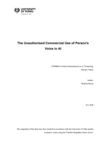 Tässä tutkielmassa tarkastellaan ihmisäänen luvatonta kaupallista käyttöä generatiivisen tekoälyn (AI) kontekstissa ja vastataan tutkimuskysymykseen: Missä määrin tekijänoikeuslainsäädäntö ja ihmisoikeussäännökset voivat tehokkaasti suojella yksilöitä heidän äänensä luvattomalta kaupalliselta käytöltä tekoälyllä luodussa sisällössä? Tutkielman tavoitteena on vastata tähän kysymykseen analysoimalla kansainvälisen tekijänoikeuslainsäädännön rakenteellisia rajoituksia ja ihmisoikeussopimusten tarjoamia mahdollisuuksia tilanteissa, joissa henkilön ääni kloonataan uutta teknologiaa hyödyntäen ja sitä käytetään kaupallisesti ilman lupaa. Tutkimus tuo esiin sekä julkisuuden henkilöiden että tavallisten ihmisten haavoittuvuuden, kun teknologinen kehitys etenee nykyistä sääntelyä nopeammin.