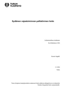 Tämä opinnäyte käsittelee sydämen vajaatoiminnan palliatiivista hoitoa. Työn tavoitteena on koota yhteen aiheeseen liittyvää tutkimusnäyttöä ja keskeistä tietoa sekä osoittaa, mitä aiheesta tulisi tutkia lisää. Sydämen vajaatoiminta on merkittävä kansanterveydellinen haaste. Se kuormittaa laaja-alaisesti potilaita, läheisiä ja terveydenhuoltoa. Sydämen vajaatoiminta on kuolemaan johtava oireyhtymä, mutta vain pieni osa potilaista saa palliatiivista hoitoa. Sydämen vajaatoiminnan palliatiiviseen hoitoon liittyvä tutkimus on vielä kehittymätöntä ja aiheesta tarvitaan lisää tietoa. Tiedon kokoaminen yhteen auttaa palliatiivisen hoidon suunnittelussa ja toteuttamisessa. Työ on toteutettu kirjallisuuskatsauksena. Aineisto on kerätty PubMed-haulla ja valitsemalla aiheeseen soveltuvia artikkeleita kansainvälisistä ja suomalaisista lääketieteen alan lehdistä. PubMed-haku toteutettiin syksyllä 2025. Aineisto koostuu pääosin katsausartikkeleista. Aineistoon on pyritty valitsemaan mahdollisimman uudet julkaisut, jotta tieto olisi ajantasaista. Sydämen vajaatoiminnan palliatiiviseen hoitoon liittyvä tutkimusnäyttö on laadultaan heikkoa. Tulevaisuudessa tutkimusasetelmia tulee kehittää, jotta tiedon yhdistäminen tutkimusten välillä onnistuu paremmin. Laadukkaan tutkimustiedon avulla hoitosuosituksista saadaan täsmällisempiä. Sydämen vajaatoiminnan esiintyvyys on suurinta iäkkäillä ja Suomen väestön ikääntyessä palliatiivista hoitoa tarvitsevien potilaiden määrä lisääntyy merkittävästi. Erityistason palliatiivisen hoidon resurssit ovat rajalliset, joten on olennaista selvittää, millä menetelmillä ja tavoilla palliatiivista hoitoa on tehokkainta toteuttaa erityisesti perustasolla. Terveydenhuollon ammattilaisten koulutusta on kehitettävä palliatiivisen hoidon osalta, jotta voidaan vastata kasvavaan hoidon tarpeeseen. Oirehoidon osalta tulee erityisesti tutkia psyykkisiä oireita ja liitännäissairauksia, koska niiden hoidossa ei ole saavutettu selkeää yhteisymmärrystä. Sydämen vajaatoiminta aiheuttaa merkittävää kuormitusta myös läheisille. Tutkimustieto läheisten psykososiaalisista sekä kuolemanjälkeisistä tukitoimista on niukkaa, joten tulevaisuuden tutkimuksen tulee ottaa myös nämä osa-alueet huomioon.