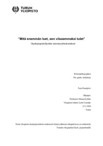 (24.02.2026)Tämän pro gradu -tutkielman tavoitteena oli tarkastella, millaisia neuromyytteihin liittyviä uskomuksia opettajaopiskelijat tuottavat avoimissa vastauksissaan ja miten nämä uskomukset rakentuvat temaattisiksi kokonaisuuksiksi. ...avoin -