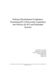 Software Development Compliance: Translating EU Cybersecurity Legislation into Practice for IoT and Embedded Systems (15.10.2025)This thesis examines how the European Union’s upcoming cybersecurity legislation will affect software in IoT and embedded devices. Motivation for the thesis has arisen from real-world Company X’s preliminary investigation ...avoin
