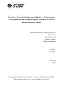 Developing a Python-Based Image Analysis Pipeline for 3D Segmentation and Quantification of Plasmodium falciparum Ookinetes from Volume Electron Microscopy Datasets (30.07.2025)Understanding the complex 3D organization of Plasmodium falciparum ookinetes is essential for uncovering how these malaria-causing parasites develop and invade their mosquito hosts. This thesis presents a practical and ...avoin