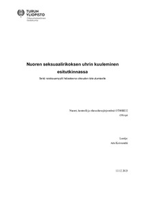 (19.12.2025)Tässä tutkielmassa tarkastellaan nuorten seksuaalirikosten uhrien kuulemista esitutkinnassa, sekä kuulemiskokemusta nuoren näkökulmasta. Tutkielmassa kiinnitetään huomiota myös yhteiskunnallisessa keskustelussa vallitseviin ...avoin -