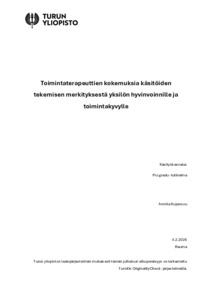 (04.02.2026)Tämän tutkimuksen tarkoituksena oli selvittää, millaisia kokemuksia toimintaterapeuteilla on käsitöiden tekemisen merkityksestä yksilön hyvinvoinnille ja toimintakyvylle. Tutkimuksen teoreettinen viitekehys rakentuu käsityön ...avoin -