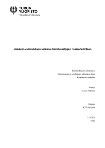 (09.12.2025)Tämä kirjallisuuskatsauksena toteutettu kandidaatintutkielma syventyy tarkastelemaan 3D-tulostustuotannon (Lisäävä valmistus; eng. ”Additive manufacturing”) vaikutusta toimitusketjujen riskienhallintaan ja resilienssiin. ...avoin -