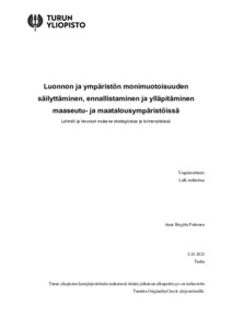 (08.12.2025)Tämän kandidaatintutkielman aiheena on luonnon monimuotoisuuden säilyttäminen, ennallistaminen ja ylläpitäminen maaseutu- ja maatalousympäristöissä. Tutkielma tarkastelee, miten maatalous voi muuttua luonnon köyhdyttäjästä ...avoin -