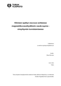 (23.02.2026)Tutkielman aihe on päivystyksellisen magneettikuvantamisen käyttö cauda equina -oireyhtymän (CES) diagnosoinnin apuna. Tarkoituksena on tutkia kuinka suuri osa CES-epäilyistä voidaan varmentaa magneettikuvalla sekä selvittää ...avoin -
