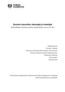 (16.01.2026)Tässä tutkielmassa tarkastellaan poliittista vastakkainasettelua, joka muotoutui sisällissodan jälkeisessä Suomessa presidentti K. J. Ståhlbergin edustaman laillisuuteen ja parlamentarismiin nojaavan vallankäytön sekä ...avoin -