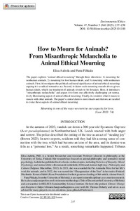 <p>The paper explores “animal ethical mourning” through three directions: 1) mourning for nonhuman animals, 2) mourning for lost human ideals, and 3) mourning with nonhuman animals. First, it investigates the political and ...