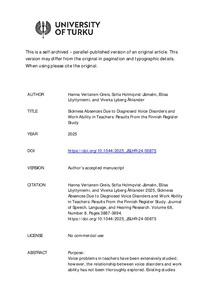<h3>Purpose:</h3><p>Voice problems in teachers have been extensively studied; however, the relationship between voice disorders and work ability has not been thoroughly explored. Existing studies have often used self-reporting ... -