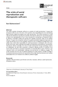 <p>The article examines therapeutic self-care as a practice of social reproduction. It argues that therapeutic self-care sits at the heart of the systemic crisis materialising from the contradicting logics between capital ... -